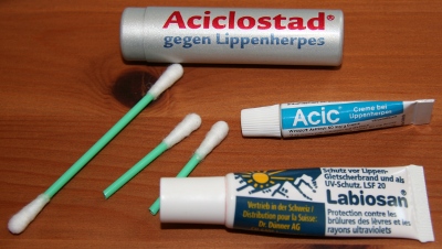 - Daher: immer Wattestäbchen mit dem Aciclovir-Mitteln bereit halten, ich schneide die in der Mitte durch, dann passen sie auch in die kleine Dose rein.