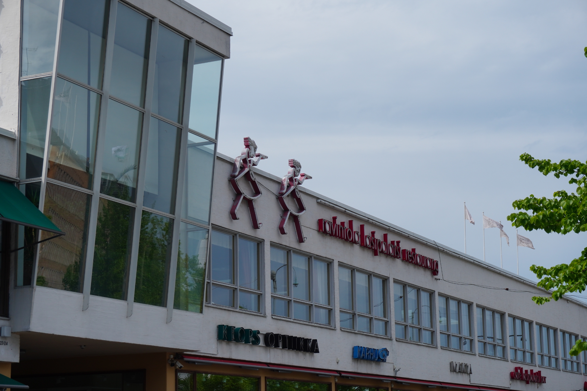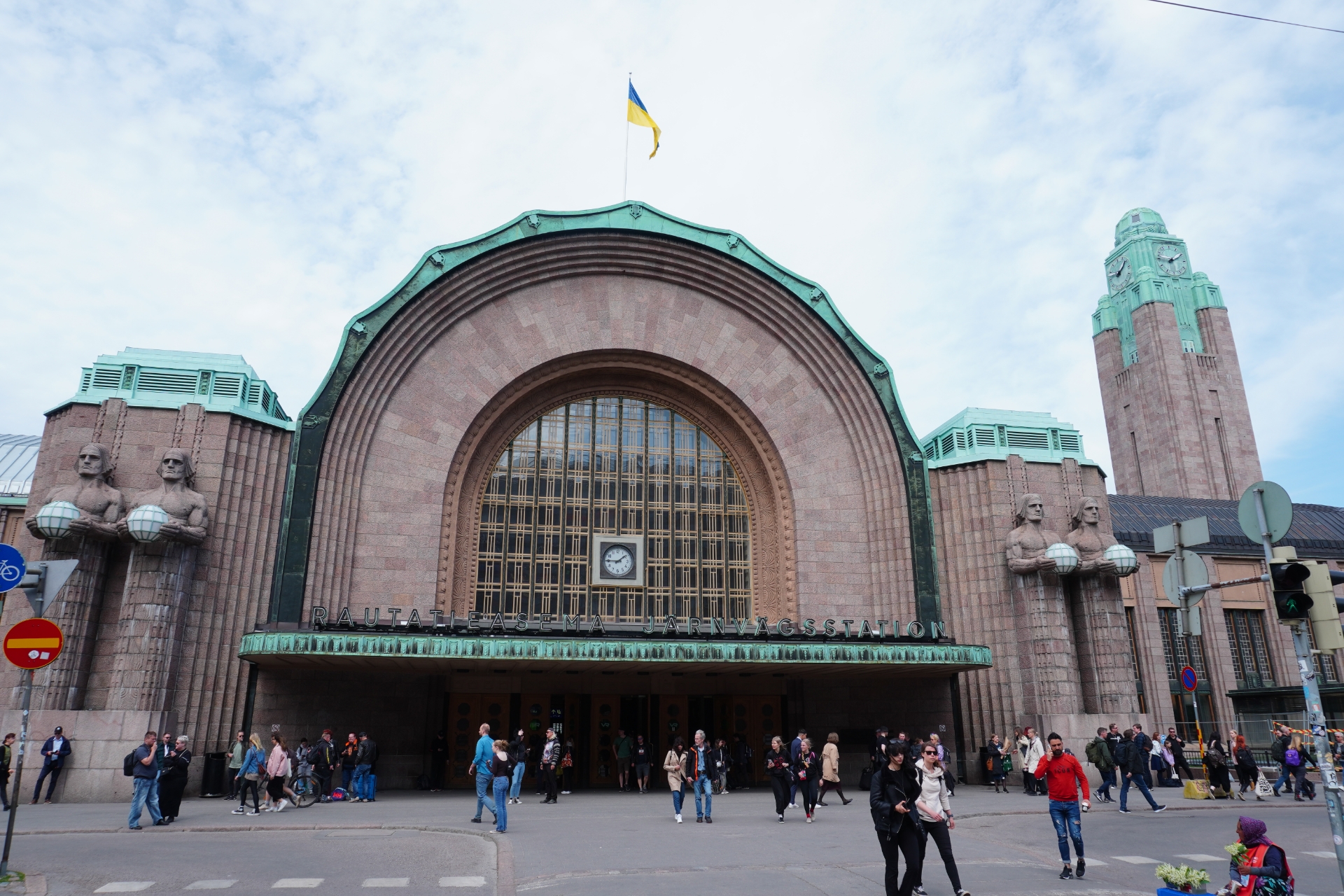 Der Bahnhof hat eine interessante Architektur, fast brutal, was die Figuren, die die Lampen halten, bedeuten, müssen wir noch erlesen. Der daneben liegene Latsipalatsi (Glaspalast) sieht aus wie aus den Werbebroschüren der 70er, zum Glück fügen sich auch moderne Geschäfte in das Bild ein, so dass ein sehr interessanter Anblick bleibt.