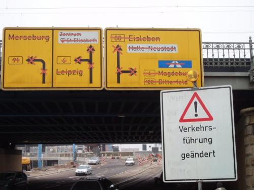 Verkehrsführung Riebeckplatz Halle (20.03.2006). Interessante Variante. (archivierter Beitrag aus rauhesitten.blog.de)